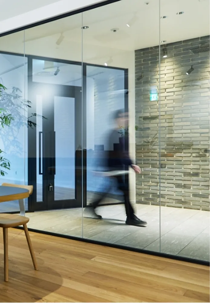 社内にはガラス張りの会議室も完備。スタイリッシュな空間は、
